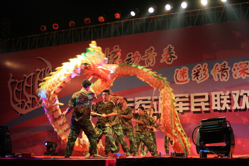 联欢会在“仰望星空”的篇章中进入高潮,伴随着《龙耀星空》的舞龙表演以及“中”“国”“龙”的演绎,军民共建祖国明天、憧憬美好未来的情怀得到了充分的体现。