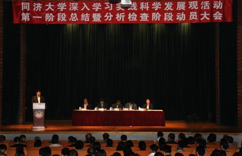 5月4日下午,我校深入学习实践科学发展观活动第一阶段总结暨分析检查阶段动员大会在一•二九礼堂召开。校党委书记、校深入学习实践科学发展观活动领导小组组长周家伦作第一阶段总结和分析检查阶段动员讲话。部属高校深入学习实践科学发展观活动第七指导检查工作组组长韩星臣出席会议并讲话。校领导裴钢、李永盛、马锦明、姜富明、陈小龙、伍江、董琦、陈以一、蒋昌俊等出席会议。会议由校党委副书记、校深入学习实践科学发展观活动领导小组副组长兼办公室主任陆敏恂主持。
