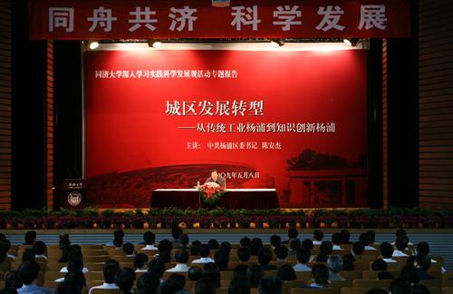 中共杨浦区委书记陈安杰来校作专题辅导报告。5月8日下午,中共杨浦区委书记陈安杰,专程来到我校,在一•二九礼堂为我校部分中层干部和师生代表600多人作题为《城区发展转型——从传统工业杨浦到知识创新杨浦》的专题辅导报告。报告会由校党委副书记、校深入学习实践科学发展观活动领导小组副组长兼办公室主任陆敏恂主持。