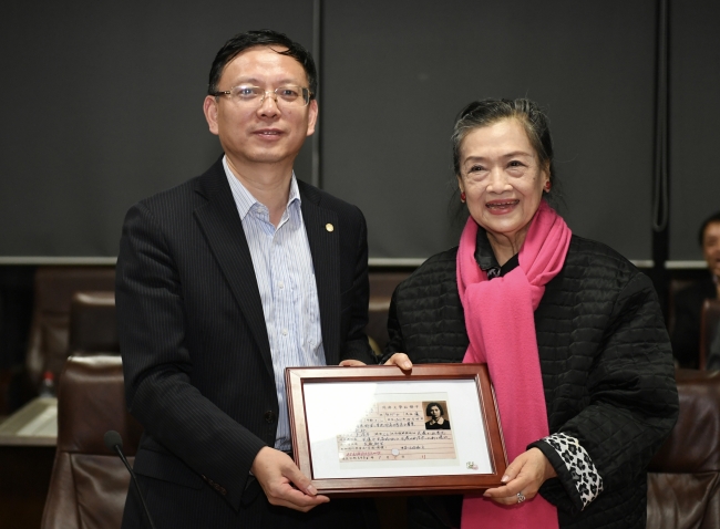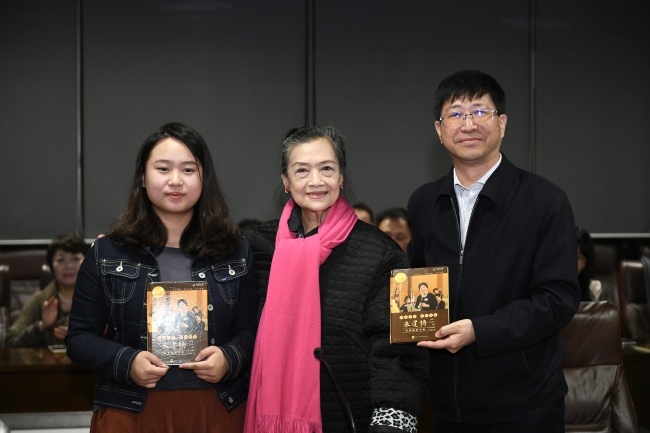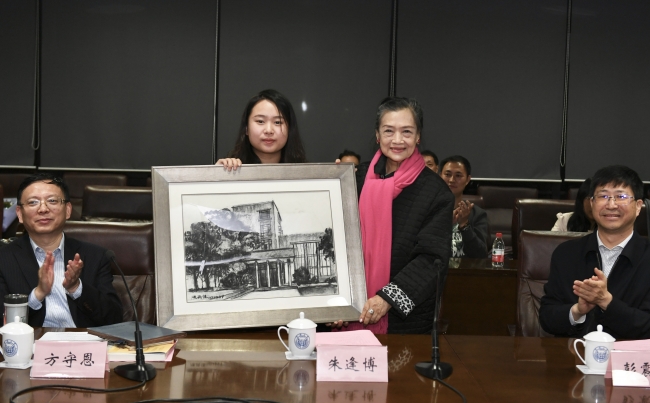 当天,朱逢博校友向母校赠送了《相逢是缘博爱如歌——朱逢博经典歌曲全辑》。该专辑中,有一首从未发行的歌曲《游子吉它》,特别献礼母校建校110周年。同济大学党委书记方守恩赠予朱逢博校友当年的学籍卡复制件。同济大学建筑与城市规划学院教师贾瑞云作为朱逢博先生的大学同学代表,为朱逢博先生赠送了班级纪念册。同济大学建筑与城市规划学院学生代表还向朱逢博校友赠送了描绘她当年就读同济时所在的文远楼的一幅画作。
