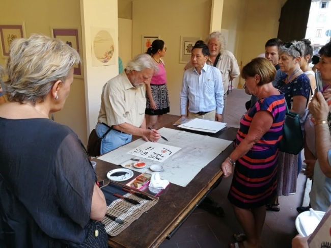 7月20至23日,同济大学师生书画与剪纸艺术展在意大利佛罗伦萨圣马可修道院举行。托斯卡纳文化协会名誉主席Fabrizio Borghini,国际书法家协会意大利总部秘书长意大利斐墨当代书法学会主席Nicola Piccioli,意大利艺术作品协会主席Leonardo Belloni,意大利华人艺术家协会副主席张丞森,校党委宣传部、工会、中意学院、软件学院、教工书画协会相关负责人与上百位当地中华文化爱好者出席。现场展出了我校教工书画协会的江理平、王建中、蒋荻老师的40余幅书法、国画、剪纸作品,以及我校学生的部分书画作品。蒋荻老师与Nicola Piccioli还在现场进行了书法展示,并将作品赠送给现场的书法爱好者。