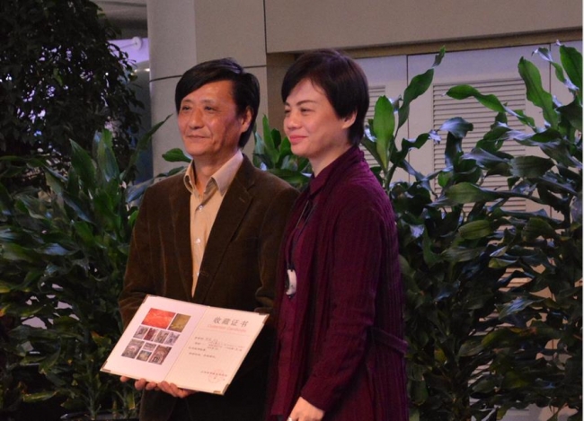 校办主任倪颖向阴佳、赵巍岩颁发作品捐赠证书