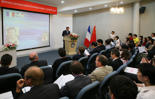 会见后,Dominique Perben部长为我校师生作了精彩演讲,并回答了我校学生提出的有关交通、法国高速列车等问题,接受了我校中法工程与管理学院学生代表张洋的礼物。