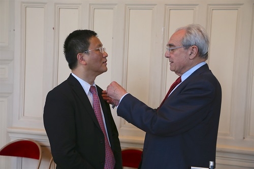 (德布雷(右)向茅凯黎颁发法国国家功勋骑士勋章,欧洲时报记者孔帆供图)