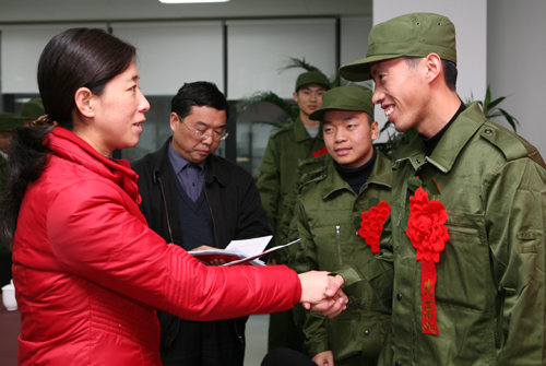 在场的“准新兵”们个个身着绿军装、胸佩光荣的大红花,手里拿着鲜红的《入伍通知书》。在欢送会上,每一位同学都表达了自己的真情实感:“此时此刻,是一个光荣的时刻,也将是一个令我终身铭记的时刻”——手按在入伍通知书上,“小兵”的心情显然还十分激动;更多的“新兵”表达了自己对参军的认识,张蓉同学说:“没有一个人民的军队,就没有人民的一切”、“大学生参军是有志于国防事业的在校大学生的一次机会,我们将投身到火热的军营中,去实现自己的人生价值!”……听着孩子们的发言,在座的家长在深感欣慰和放心的同时,也对自己的孩子提出了殷切的希望。