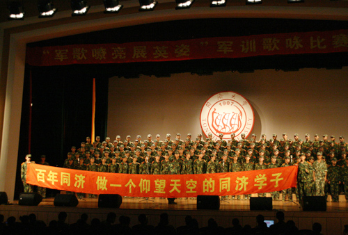 风在吼,马在叫,黄河在咆哮……”9月6日晚7时许,伴随着三营《黄河大合唱》的雄壮歌声,2007年同济大学军训歌咏比赛在学校大礼堂唱响。由06级同学组成的10个营31个连以及部队军训旅的教官们欢聚一堂,引吭高歌,抒发豪情。校党委副书记马锦明、军训旅旅长、上海警备区吴跃忠上校等到场观看了比赛。最终,通过现场评比,十营获得特等奖,七营、八营获得一等奖。
