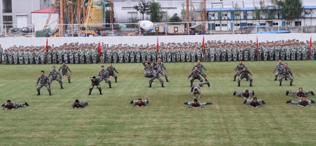 随后,分列式正式开始,17个方阵依次通过主席台接受检阅。他们队列整齐、精神饱满、口号震天、步伐有力、英姿飒爽,向领导们展示了本次军训的训练成果。在《男生军体拳》、《女生军体拳》、《男生捕俘拳》、拳术和擒拿表演四个军训科目汇报中,精彩的表演赢得全场人员的阵阵掌声。