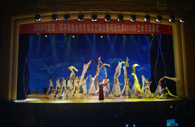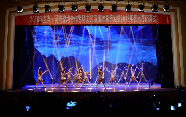 “君住长江头,我住长江尾。日日思君不见君,共饮长江水。”12月23日晚,同济大学大礼堂声乐阵阵,灯火辉煌。“共饮长江水”宜宾同济校地合作专场文艺演出在此举行,同济大学 2016 年艺术节圆满落幕。我校常务副校长伍江、党委副书记马锦明、校长助理周佳,宜宾市人大常委会主任陆振华、宜宾市政协主席葛燎原、宜宾市委副书记邓正权、宜宾市委常委、组织部部长蒋刚、宜宾市委常委、副市长、宣传部部长李敏和各有关部门领导,与3000名我校师生一起,共同观看了演出。伍江、邓正权分别致辞。