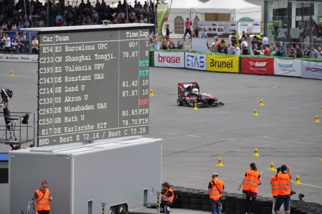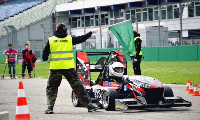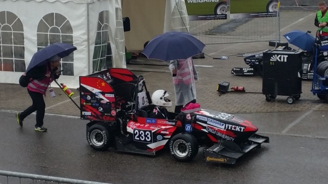 从上海经转莫斯科再到法兰克福,舟车劳顿没有消磨队员们的斗志,参赛队员们早早地通过了车检并赶在八字绕环开始之前进行了三轮动态练习。在完全湿地的八字赛上,233号战车似乎没能占到任何优势,只得到了一个中规中矩的成绩。但在第二天的直线加速赛中,赛车用4.08秒的成绩刷新了油车最快记录。印着五星红旗的233号赛车成功地让所有人都记住了他的风姿!虽然在复检中因为前翼高度过高而被罚分,并且影响到了高速避障的成绩,但是在最后一天的耐久赛中,车队依旧顶住了重重压力,以完赛时的全场最快圈速,刷新了中国车队的最好成绩!