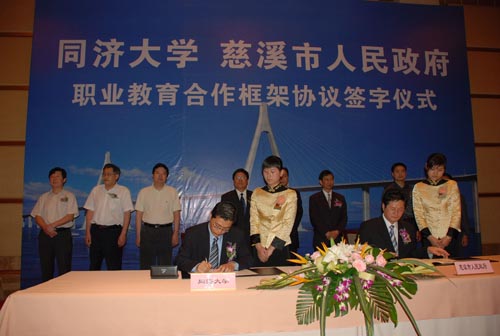 同济大学职业技术教育学院党总支书记王继平和慈溪市市长徐华江分表代表双方在协议上签字。该协议的签署标志着同济大学以职教学院为承担主体与慈溪市人民政府开展职业教育合作办学的序幕正式拉开。
