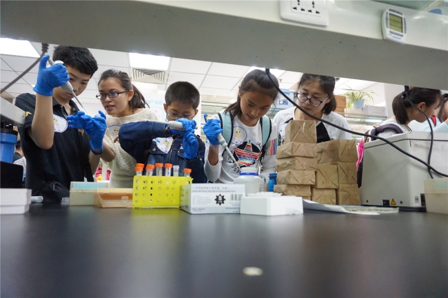 讲座结束后,小观众们来到重点实验室参观。孩子们第一次看到了“神秘、高大上”的生物实验室长啥样,并参加了一系列实验体验活动,亲手摸摸实验室里“枪”,自己动手给细胞“涂涂色”,体验一次体细胞核移植克隆之旅,与熟悉而又陌生的模式动物——果蝇、小鼠来个亲密接触,了解肿瘤治疗中的“巡航导弹”——抗体靶向药物的抗癌原理……在绿巨人协会志愿者们耐心细致的讲解和指导下,孩子们收获颇丰,无不感叹生命科学的奇妙与神秘。