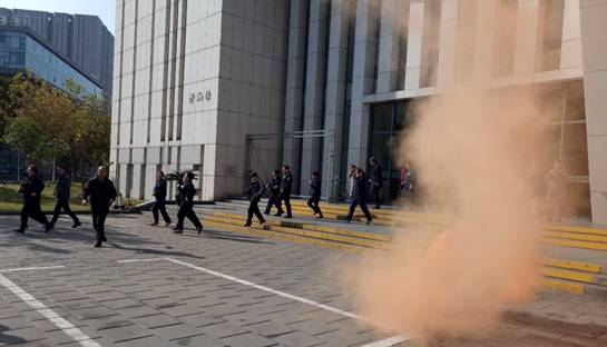上午10:00,伴随着大楼前升起的浓烟,急促的消防警报响起,参与演习的师生及物业人员在疏散引导员的指引下,用毛巾捂住口鼻,迅速、有序、安全地从大楼内向前广场撤离。2分钟内,全体人员按预定的疏散路线迅速撤离到了指定地点。
