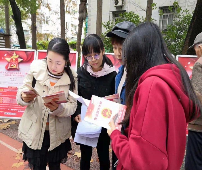 在学生社区,党员同学们则以党支部为单位,在社区党建活动室组织集体学习宪法,原原本本、逐章逐条学宪法,深刻领会精神实质,把握核心要义,把学习宪法作为履行职责的基本功和必修课,并为社区同学进行宪法普法宣传,为同学们答疑解惑。