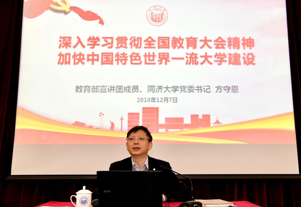 12月7日上午, 我校离退休干部大会在逸夫楼一楼报告厅召开。教育部宣讲团成员、同济大学党委书记方守恩为老同志们作了题为《深入学习贯彻全国教育大会精神加快中国特色世界一流大学建设》的主题报告。学校近三百名离休老干部、退休老领导,关工委、老教协、老科协老同志,退休党支部书记和委员们出席了会议。