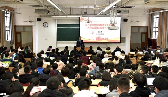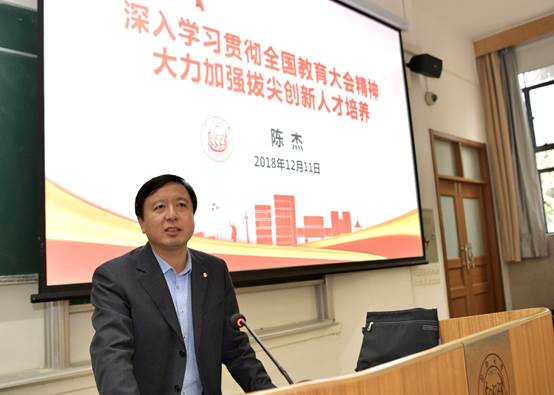 陈杰传达和解读了2018年全国教育大会的内容,带领同学们学习和领悟了当前和今后一段时期党对教育工作的总部署、总方略,分析了习近平总书记关于教育的重要论述中所体现的鲜明的政治性、高度的战略性、强烈的人民性、深刻的规律性、突出的创新性。总书记在全国教育大会上指出,培养什么人,是教育的首要问题,陈杰对此进行了解读。陈杰表示,目前我国正处在世界新一轮科技革命和产业变革同我国转变发展方式的历史性交汇期,牢牢抓住科技革命机遇事关中华民族的前途命运。中国当前对科技创新和科技创新人才迫切需要,而对科技创新人才中的基础研究人才的需要尤为迫切。