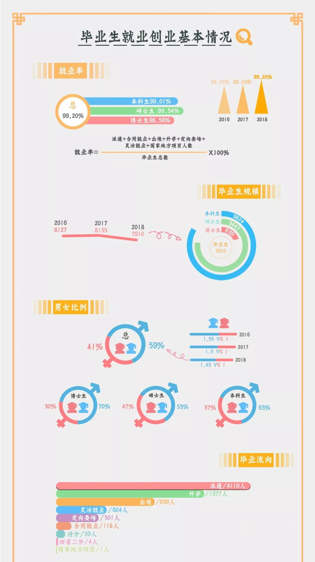 我校2018届各学历层次毕业生共有7910人,包括639名博士毕业生、3447名硕士毕业生、3824名本科毕业生。在社会就业总体压力较大的环境下,2018届毕业生就业率创近年来新高,达99.20%。纵观我校近三年毕业生就业率,总体就业情况良好,就业率均超过99%,各学历就业率均稳中有升。