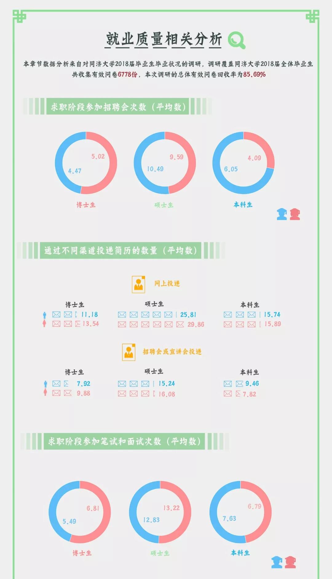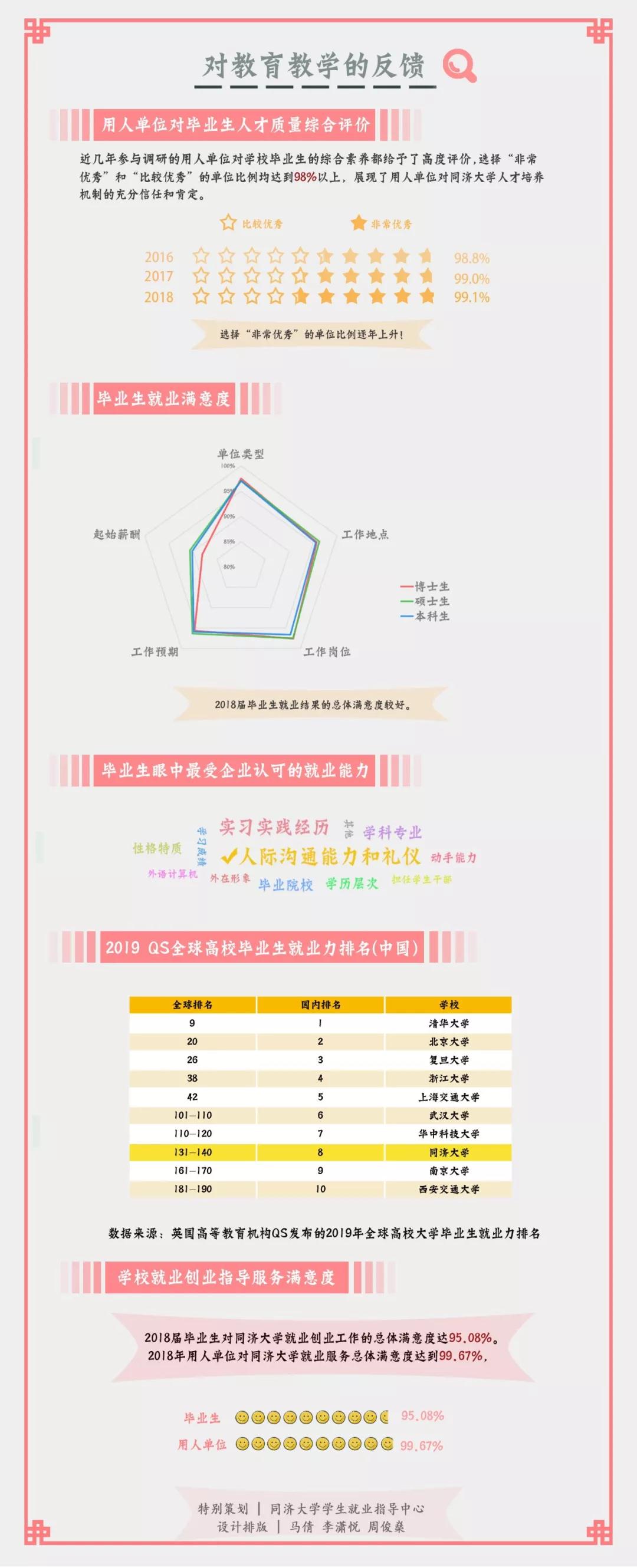 截止2018年11月20日,我校2018届毕业生总体就业率达99.20%,毕业生需求比为20.02:1;毕业生赴重点领域就业率达60.82%;用人单位对我校毕业生人才质量好评率超过99%……1月10日, 《同济大学2018年毕业生就业质量报告》发布,一个个刷新的数据,显现了近年来我校大力加强毕业生就业引导工程所产生的积极效应。
