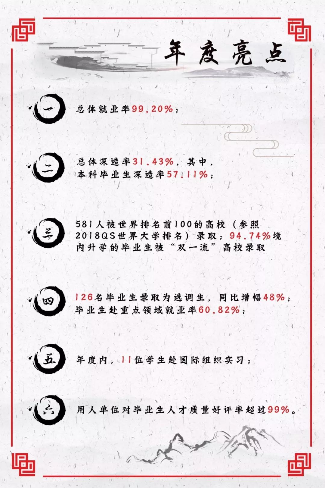 在全体深造毕业生中,登记升学的共有1577人。在升学去向的毕业生中,共有1462人被世界一流大学建设高校录取、32人被世界一流学科建设高校录取,被“双一流”建设高校录取人数占升学毕业生总人数的94.74%。