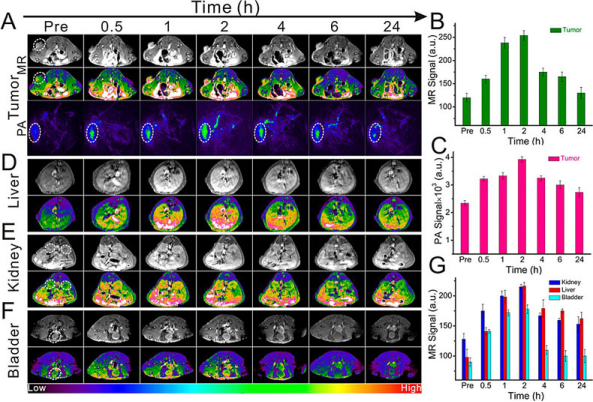 图2:基于酶活性的Gd@HRPABTS 探针在肿瘤微环境中的特异性光声成像及MR成像