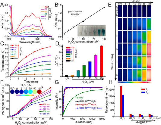 近日,该课题组首次利用辣根过氧化物酶(HRP)介导仿生合成超小Gd纳米探针,同时仿生集成底物2,2-联氮-二(3-乙基-苯并噻唑-6-磺酸)二铵盐(ABTS),最终获得Gd@HRPABTS 诊疗探针。他们发现反应前后HRP的活性得到有效保持,并测试计算得到大约70%酶活性得以保持。随后利用酶活性,将酶仿生合成与酶催化相结合,利用肿瘤组织富含的H2O2触发HRP酶活性,并高效催化ABTS转化成光敏性ABTS•+,后者具有较强的近红外光吸收能力,并能将光能高效转化成热量,实现肿瘤微环境响应的光声成像与光热治疗,并全程利用Gd纳米粒进行MR成像引导。