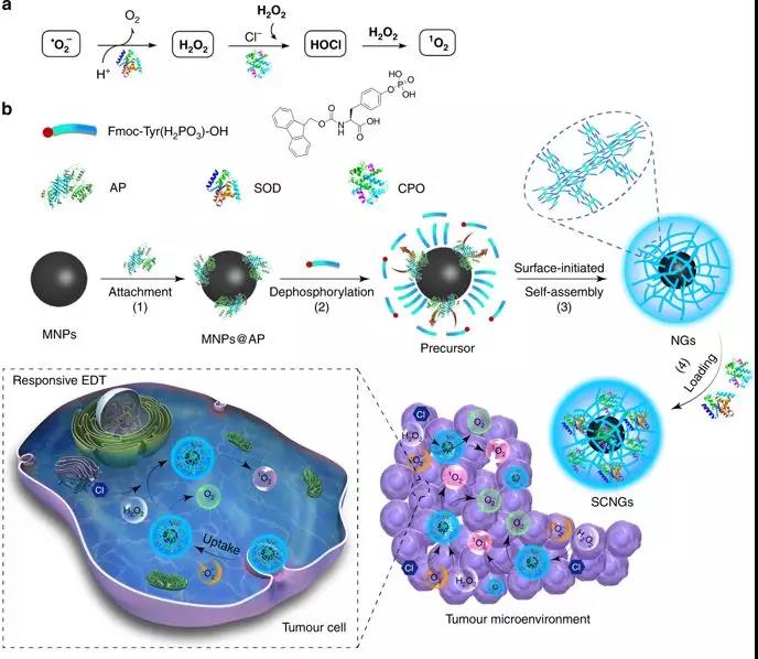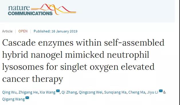 中性粒细胞作为向肿瘤组织迁移的第一道天然免疫细胞,可以立即杀死异常细胞,激活长期特异性的适应性免疫反应。因此,酶介导中性粒细胞的活性氧(ROS)升高是一种很有前途的肿瘤免疫治疗策略。1月16日,我校王启刚教授团队在Nature Communications上发表题为“Cascade enzymes within self-assembled hybrid nanogel mimicked neutrophil lysosomes forsinglet oxygen elevated cancer therapy”,设计了一种纳米凝胶,通过表面磷酸酶触发了铁氧化物纳米粒子周围寡肽的自组装,以模拟产生的中性粒细胞溶酶体。超氧化物歧化酶(SOD)和氯过氧化物酶(CPO)在生物激发纳米凝胶中的级联反应可以将肿瘤组织中的活性氧转化为次氯酸(HClO)和1O2,可以治疗没有外部能量激活的肿瘤。