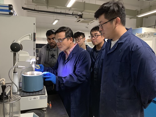 在沥青材料流变行为实验中,肖飞鹏教授(中)带领中外学生开展科学实验。