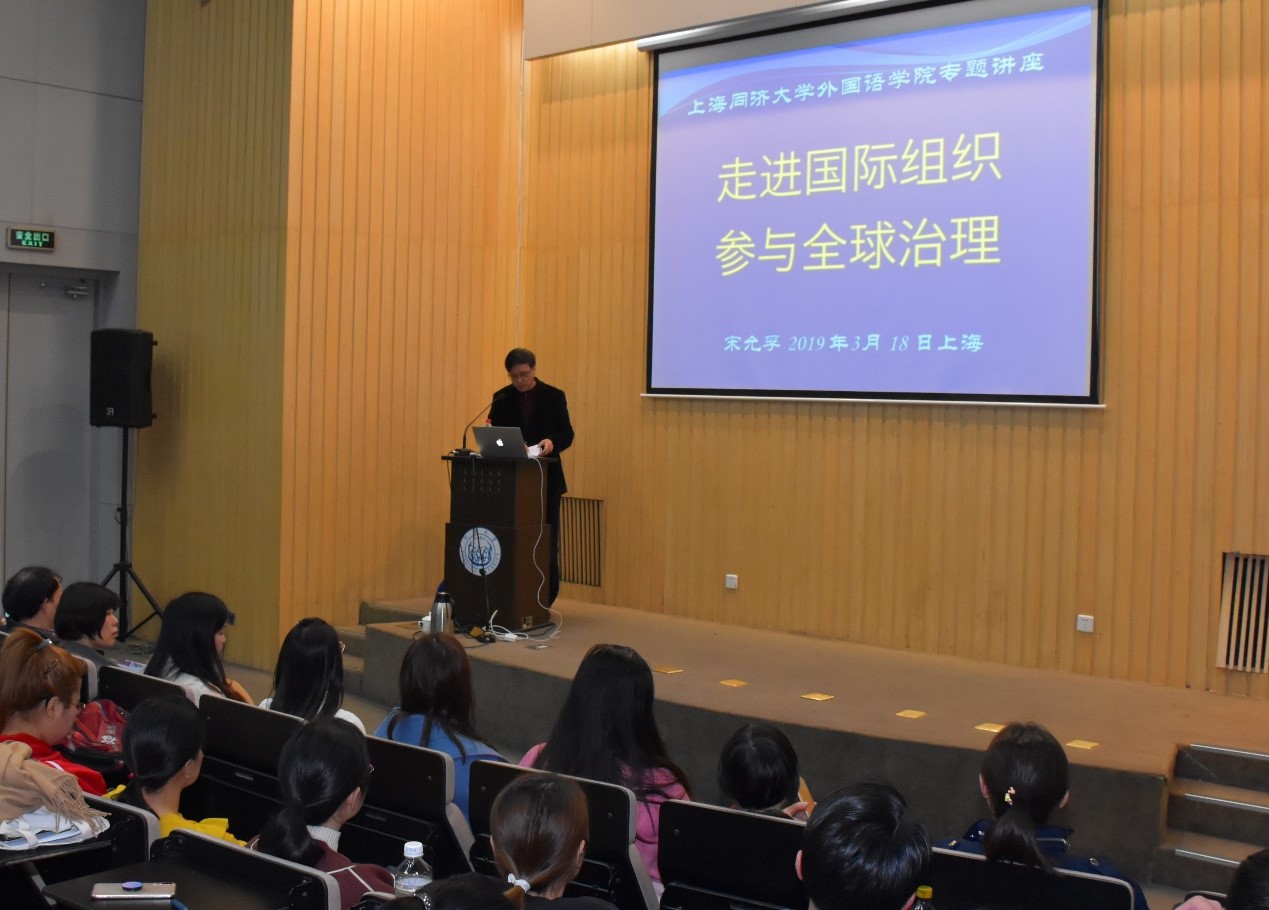 3月18日、19日两天,世界卫生组织前资深外交官、卫生部外事司原司长宋允孚先生应同济大学外国语学院邀请,担任讲座嘉宾,在同济大学衷和楼1002报告厅做了有关“国际组织”的系列讲座。