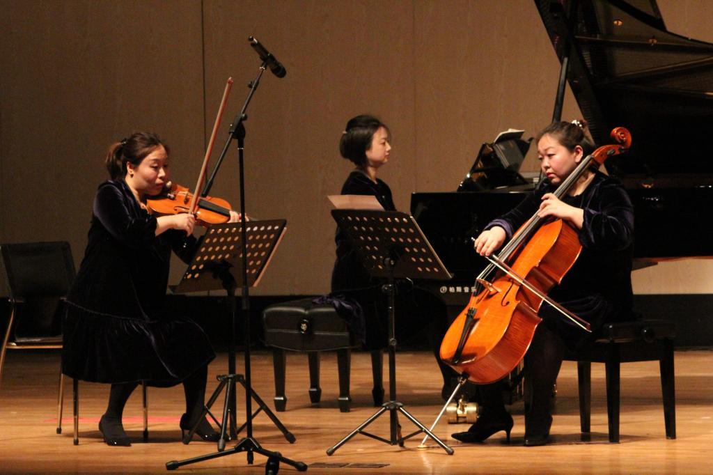 4月15日, 梧桐三重奏主题音乐会还在我校嘉定校区济人楼101献演。结合我校开设的星期音乐会课程,周莹、齐琳、张意嘉三位演奏家组成的三重奏组合成功用丰富的乐音、精湛的技术征服了在场五百余位师生的心。