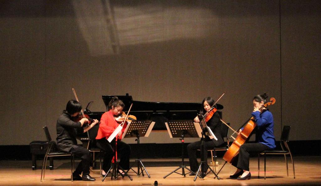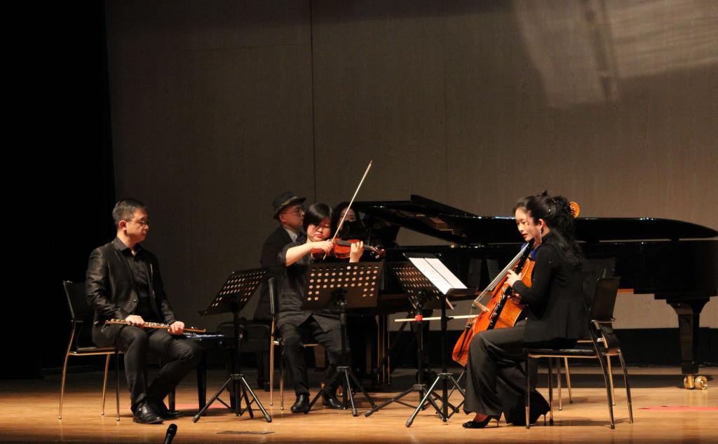 本场音乐会先后演绎了弦乐四重奏《戈壁赞》、室内乐协奏曲No.3《分流》、弦乐四重奏《刺青的雪》及单簧管与弦乐四重奏作品《音诗-黄昏》共四部作品。音乐会在曲目的选择上既充分展现了我国民族文化特色,又彰显了中西音乐文化的交融,在沈婷、马轲、杜娟、沈竞之、温宇昕、黄小珊、秦川等老师的合力演奏下,音乐的细节也得到了淋漓尽致地呈现。其中最后一首单簧管与弦乐四重奏作品《音诗-黄昏》由本次音乐会主持人沈叶老师作曲。沈叶分享了当时的创作感想,作曲部分灵感来源于海子的诗歌《黎明和黄昏——两次嫁妆,两位姐妹》,其中“黄昏”这一意象让他生发了许多思考。在他的乐曲中,“黄昏”既是写实,也象征着人生末年、变化终结等多种含义。在演绎过程中,五种演奏乐器既要相互融合,又要进行相互“竞赛”,一个持续的声音上有多种细微变化,在轻微的音调转变中还原了黄昏时的环境音,让人仿佛置身于真实的黄昏场景。