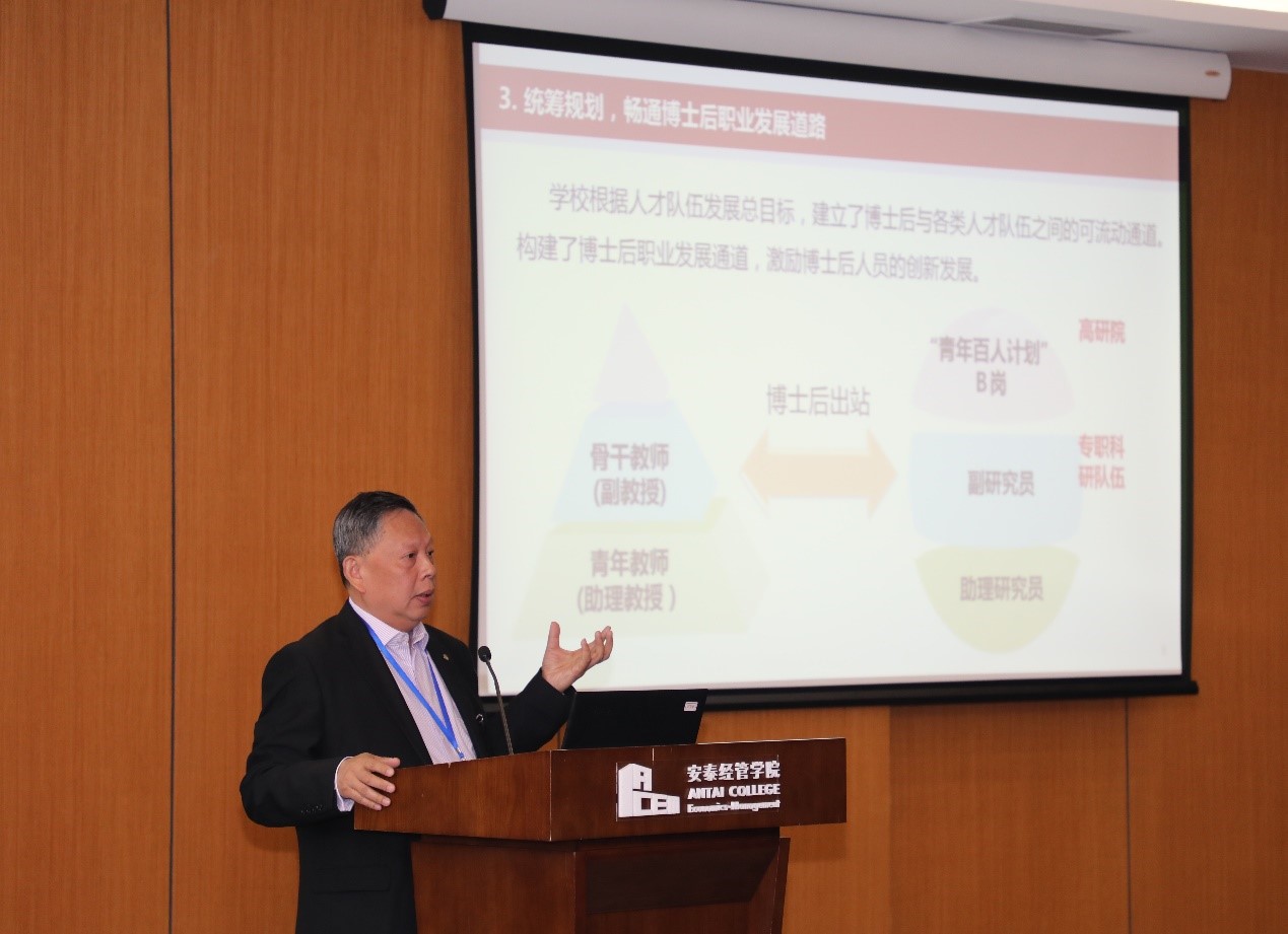伍江以“不断完善和发展博士后制度,打造博士后科研生力军”为主题,交流了我校博士后队伍专职科研队伍建设情况和举措。近年来学校围绕人才队伍建设中心工作,聚焦博士后工作新要求,明确了博士后队伍发展定位和未来发展目标,健全博士后薪酬体系,切实提高博士后待遇;统筹管理,发挥导师、流动站在博士后管理中作用;统筹规划,畅通博士后职业发展道路;服务保障与人文关怀相结合,做好博士后管理服务工作等,提升了博士后制度的吸引力,进站博士后数量、质量同步提升,在站博士后高质量科研成果不断涌现,博士后队伍建设取得显著成效。
