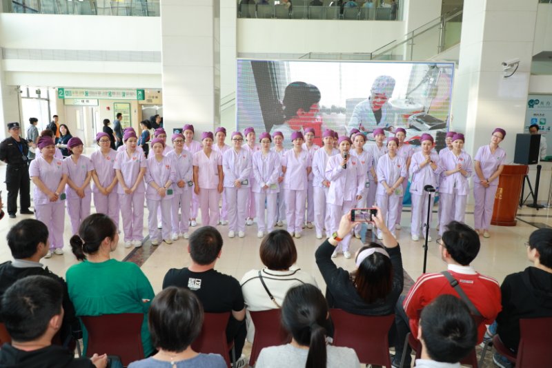 突然间,门诊大厅奏响悠扬的琴声,动听的歌声随之唱响。“天使翩翩飞来,选择了这里不再离开;红颜易逝青春无悔,守望着生命的日出与花开。目光穿越云彩,将幸福拥抱入怀;与你心手相牵,做母亲最坚定的依赖……”数十名穿着各式工作制服的一妇婴医务工作者从四处聚拢,合唱中国助产士之歌《守望生命花开》。现场氛围马上热烈起来,前来就诊的市民纷纷用照片和视频记录下医院里这场难得的快闪表演。