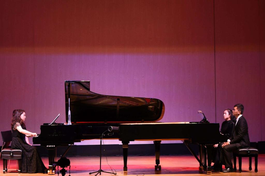 每曲终了,齐欢都会走上台来向观众介绍该曲的弹奏者。桃李同聚,师生情切,本次音乐会得以邀请到众多校友回母校演出,这些校友中的很多人在校时就已在国内外赛事中频频获奖,毕业后大多以优异的成绩和全额奖学金被印第安纳大学音乐学院、曼哈顿音乐学院、曼尼斯音乐学院、皇家伯明翰音乐学院、上海音乐学院等录取深造。我校音乐表演专业钢琴方向的校友们现就职于美国曼菲斯大学音乐学院、浙江音乐学院、上海音乐学院、上海音乐学院附中、瑞音钢琴学校等专业院校及高校。