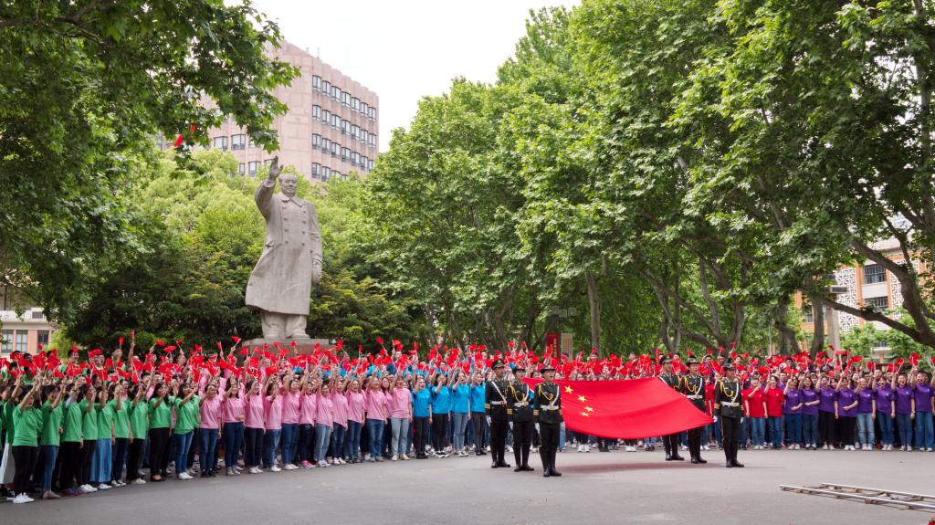 同济大学校史馆前,马克思主义学院思政理论课教师与学院学生、同济大学学生学习习近平新时代中国特色社会主义思想研究会的学子一道,深情放歌同济大学原创歌曲《青春中国》:“多少次梦中诉说,你是我豪迈的祖国,世代的劳作,汗水浇灌了秧禾……”火红的T恤,激荡着炽热的爱国之情。马克思主义学院特聘教授陈大文说:“爱国是一种深沉的情怀,表达这种情怀需要仪式感。今天我们与学生共同唱歌抒怀,让此时此刻显得格外不同,它能唤醒我们的真情,使我们感到特别庄严和神圣。我相信,它能凝聚起磅礴的爱国力量。”