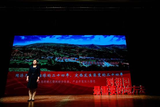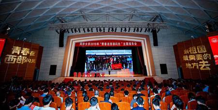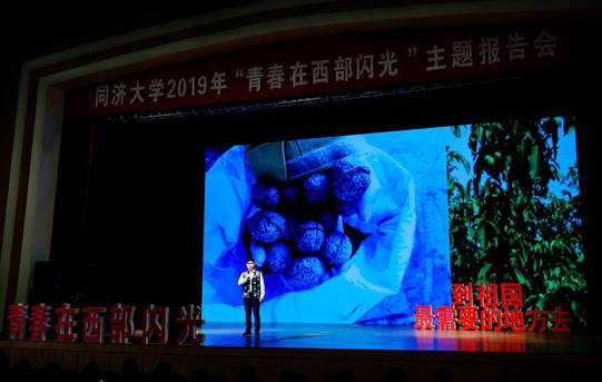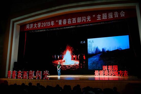 同济大学112年来一路秉承“与祖国同行,以科教济世”的办学传统和育人理念,教育引导青年正确认识世界、全面了解国情、把握时代大势,树立心怀天下、济人济事的家国情怀,鼓励更多的优秀学子到基层去、到西部去、到祖国最需要的地方去,锻炼成才、建功立业。为深入学习贯彻习近平新时代中国特色社会主义思想和党的十九大精神,进一步贯彻落实全国高校思想政治工作会议和全国教育大会精神,同济大学党委学生工作部、研究生工作部于2019年5月21日分别在四平路校区大礼堂、嘉定校区济人楼101报告厅举办“青春在西部闪光”主题报告会,全校34个学院共计2500余名师生参与报告会。