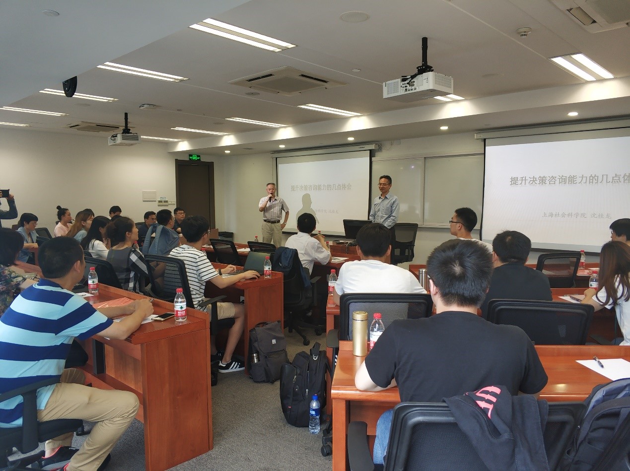 上海社会科学院世界中国学研究所所长沈桂龙,同济大学经济与管理学院特聘教授程国强分别作题为《提升决策咨询能力的几点体会》和《政策咨询研究:问题导向与问计实践》的精彩报告。报告内容结合了决策咨询报告写作实例,翔实生动地讲解了决策咨询研究选题确定、写作技巧、政策咨询研究的优势等内容。与会师生反响热烈。