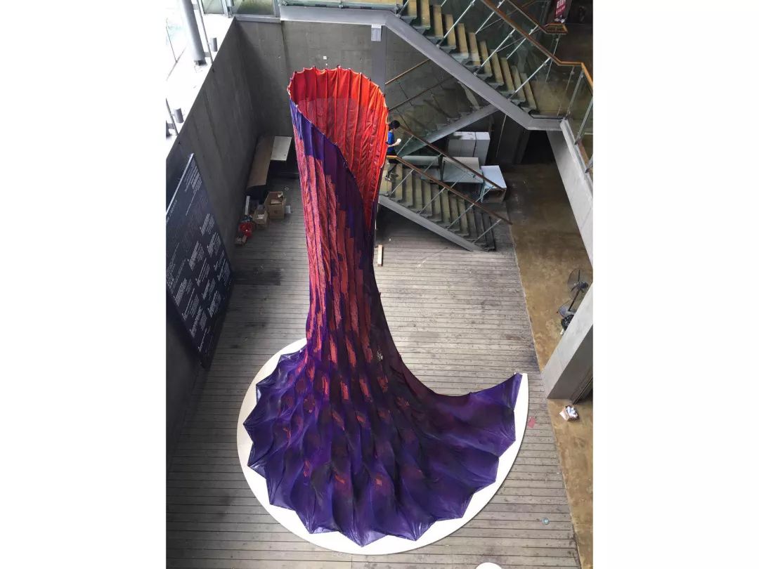 第2组致力于通过和一组由可移动机器人驱动的布料进行互动,建立一种可变形的柔性建筑。移动机器人被放置在框架结构的顶部平台,并通过一组磁铁连接和移动布匹。每个机器人由两台直流电动机驱动,并作为单独的动态执行器。这些机器人在布匹移动变化下产生响应式柔性环境。通过一定的人的输入,这些移动机器人以群体的形式移动,产生预期的舞蹈效果。此外,这些移动的布匹通过不同的透明度和颜色的创造了另一层有趣的环境氛围。
