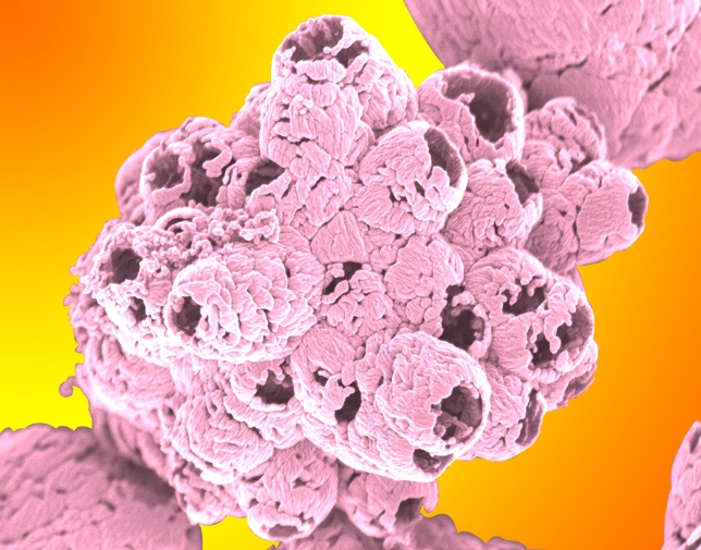 作品背景:本图为实验过程中研究不同反应时间下石墨烯水凝胶生长情况的SEM图片,图中可以观察到石墨烯水凝胶在220℃,反应时间为48小时条件下得到的类空心松子状的材料。