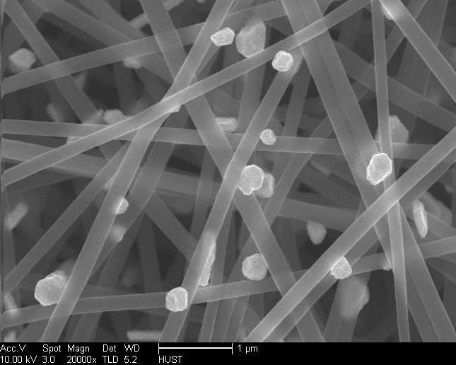作品背景:通过静电纺丝的手段制成的铜纳米颗粒和碳纳米纤维的复合材料,具体是将PAN和一水合醋酸铜的溶液在17KV的电压下进行纺丝,得到的产物在280摄氏度进行稳定化处理,再在Ar气氛下900摄氏度碳化处理,就得到了颗粒镶嵌在纤维中的结构,这样的结构有效束缚了Cu在反应中的溶解,大大提高了电池的循环能力。