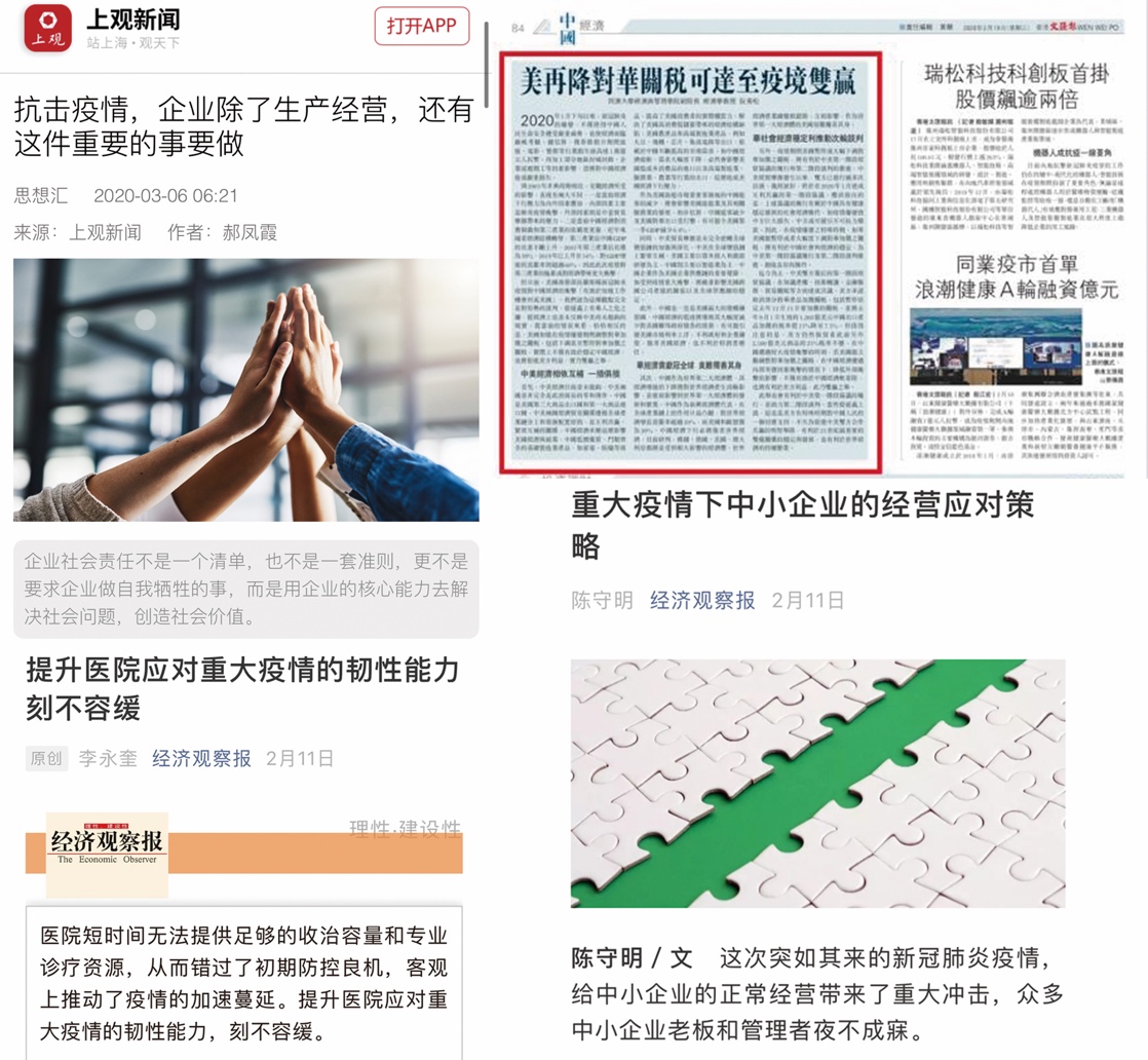 疫情期间,学院鼓励院内老师利用学科优势积极为疫情防控和社会治理建言献策。学院先后在官方微信平台发表了20余位学院老师及其学生的40余篇文章,涉及重要农产品有效供给、社会治理、企业应对、疫情防控、经济运行、应急管理、复工复产等焦点话题。部分文章先后在《人民日报》《光明日报》《解放日报》《经济观察报》和香港《文汇报》等境内外媒体平台发表。学院师生们践行“把论文写在祖国大地上”的同济担当,为抗疫贡献同济专业智慧。