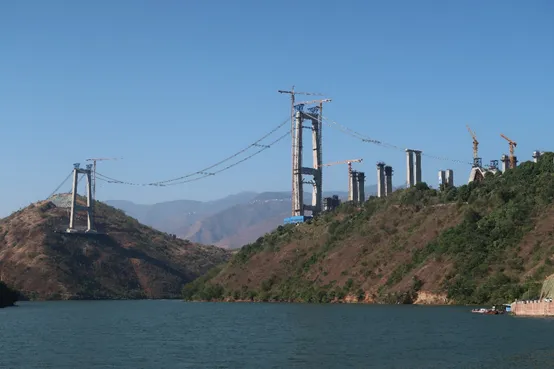 由同济检测一所负责施工监控的红河特大桥是云南省红河哈尼族彝族自治州的重点建设工程,该工程的成功建设对加快我国少数民族地区精准开发、扶贫和促进国家经济社会发展具有重大意义。大桥全长1366米,主跨700m,为悬索桥结构,采用两根直径580mm钢索主缆承受桥面重量,主缆两侧锚固于两岸重力式锚碇,中间两座主塔将主缆调高跨过水库,建水岸塔高181.286m,元阳岸塔高122.5m,主缆设57个吊索吊起钢箱梁。主梁为整体式流线型钢箱梁结构。钢箱梁全宽29.5m,梁高3.0m,重9700吨。库区水面距桥面高达188.4米,桥面宽25.5米。