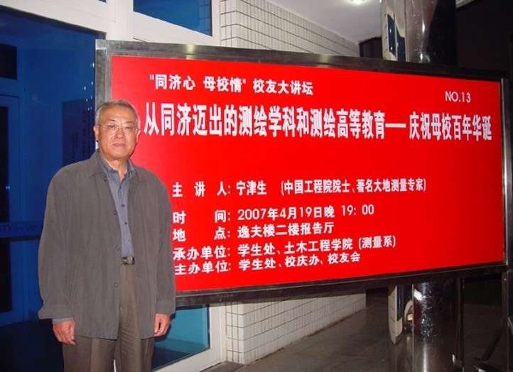 宁津生院士长期关心和支持母校的教学、科研事业。自上世纪九十年代起,宁津生院士受聘担任同济大学兼职教授,致力于测量系师资队伍的建设。1999年,宁津生院士受聘担任同济大学测绘与空间信息研究所所长,助力测量系科研水平的提升。2007年,同济大学百年校庆之际,宁津生院士受聘担任同济大学第一届董事会董事并于此后连任数届,为同济大学的改革发展积极建言献策。2012年5月,同济大学成立测绘与地理信息学院。宁津生院士和多位院士、专家一起将《测绘学概论》的课堂搬到了同济大学。课程充分发挥院士在卓越人才培养中的引导作用,支持和激励更多的优秀学子投身于测绘事业。宁津生院士不遗余力地、全方位地为母校同济大学、同济大学测量系及测绘与地理信息学院的发展倾注心血,从同济测绘学科博士点、重点学科到一流学科建设,都留下了他深深的印记和无私的奉献。
