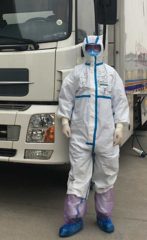 第二天,姜波和战友吴哲峰进入帐篷,穿着防护服。“第一次穿,很费劲,孙贵新队长和吴文娟主任一边指导一边帮助我们。穿上去以后,眼睛很快被雾得看不清楚了。”姜波说,我和吴哲峰两人分工,他开车,我在前面引导。可是,穿上防护服的姜波,走路不像平时了,变形走样得厉害:姜波歪着身子、斜着脑袋走在长长的、光线不太好的甬道里。