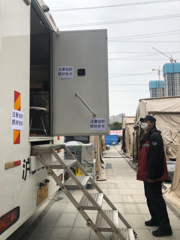 姜波说,最难的是外接电源了。因为车不能老是发动着,方舱里面防疫安全起见也不能带手机,因此也就无法求助。电源接哪里、怎么接,就只能靠我们俩商量着解决。按照舱内熟悉情况的工作人员指点,我们在医疗废品处理站边找到了一个接口,此时,患者已经在排队了,我们心里那个着急(早通早做)呀!好在吴哲峰是多面手,不大一会儿,电源接通,调试完毕,车上检测就开始了。