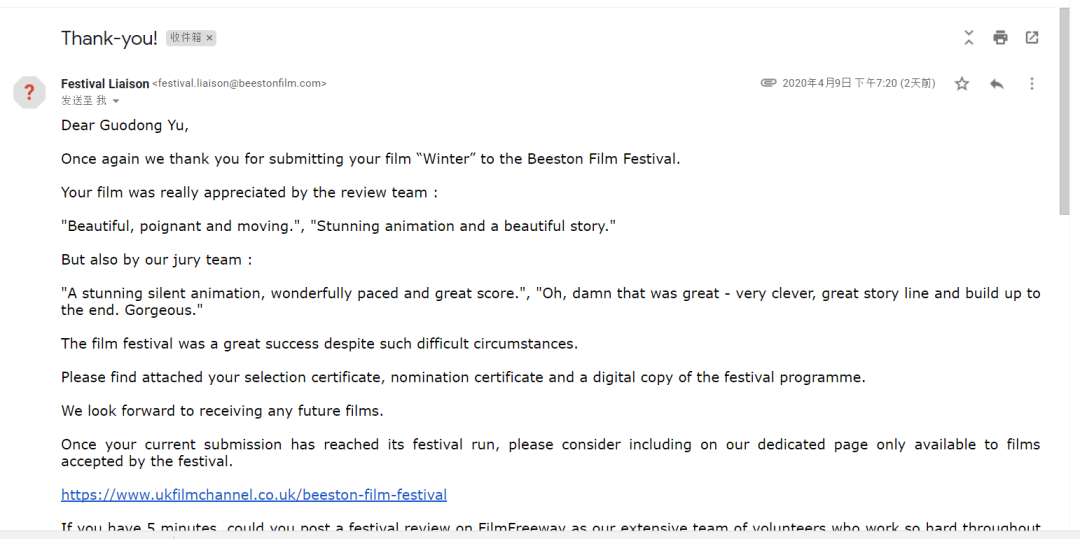 “画面唯美、意义深刻而且感情动人”,本次电影节动画单元评审给予这一作品以高度评价时说道。受疫情影响,本次获奖结果公布通由社交平台线上进行,一同获得提名的还有来自加拿大、英国的动画作品。对于此次获奖,余国冬表示:“谢谢比斯顿电影节对我的短片《冬》的评价以及颁发的比斯顿电影节动画单元最终赢家奖。谢谢学校和所有支持帮助过我的人!我会继续努力,继续创作”。