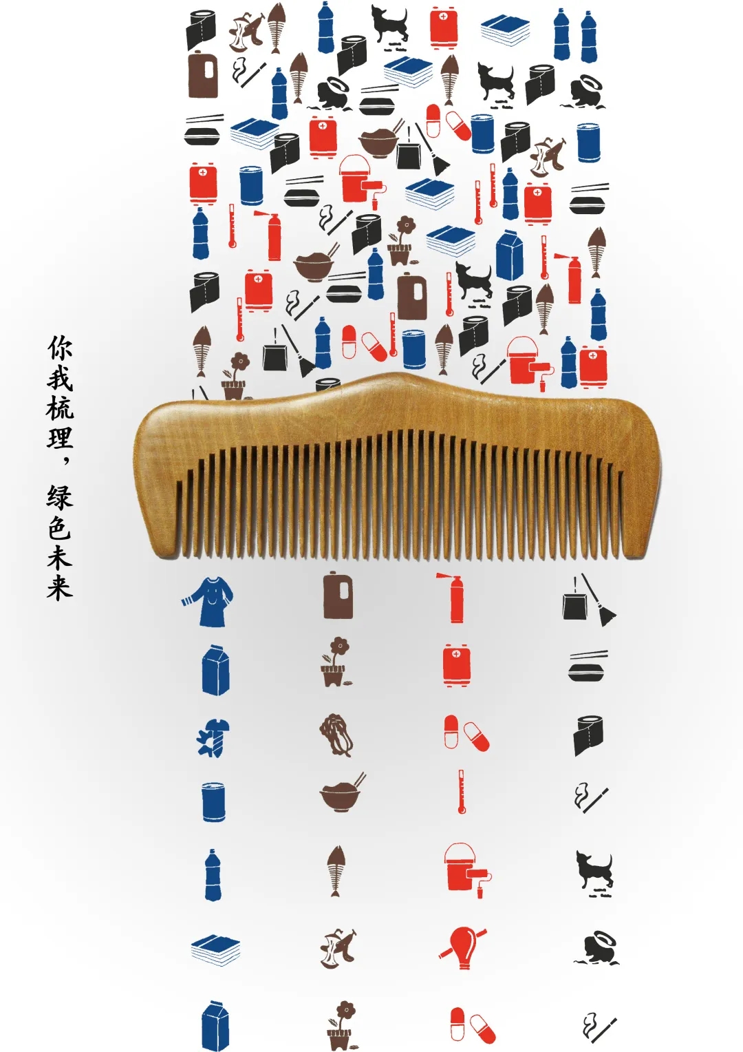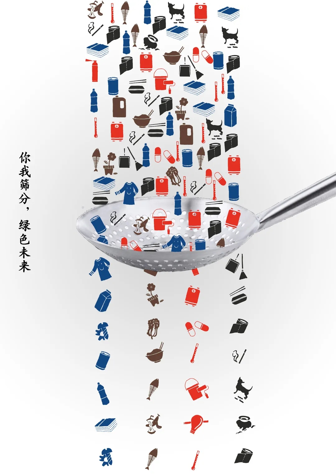 获奖作品将人们垃圾分类的过程比作用梳子去梳理、用漏勺去筛选,无序的“垃圾”小图标经过分类后都变成了整齐排列的四排。对于此次获奖,袁玉瑶表示,选择垃圾分类这个主题,是因为2019年垃圾分类的政策刚刚开始落地实施,它其实是一件改变人们日常生活方式的大事,所以想用海报的方式去表达一些自己的想法。