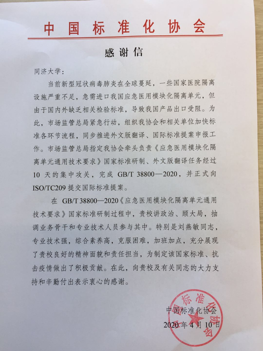 中国标准化协会来信感谢我校为《应急医用模块化隔离单元通用技术要求》国家标准研制作出的贡献