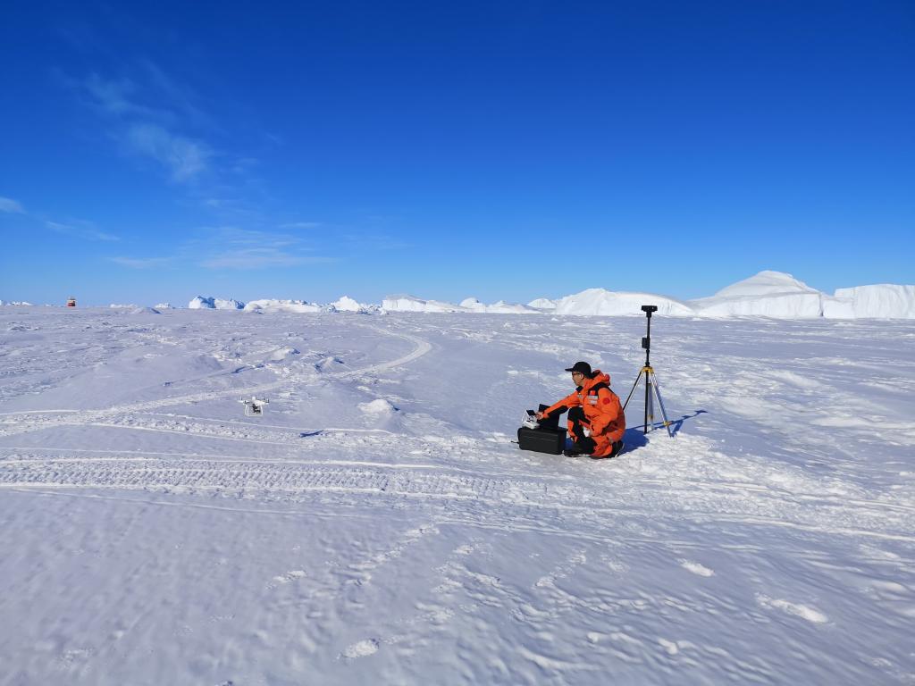 乔刚在海冰上进行无人机航测-远处为“雪龙2”号破冰