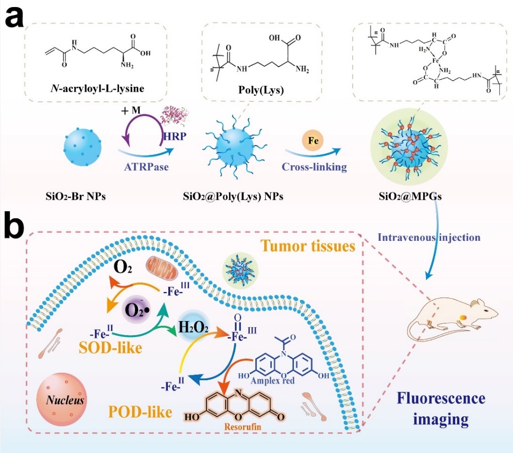 图1.(a)人工多酶凝胶体系的ATRPase及配位交联制备流程(b)模拟SOD和POD级联酶催化的肿瘤微环境响应的荧光成像机制。