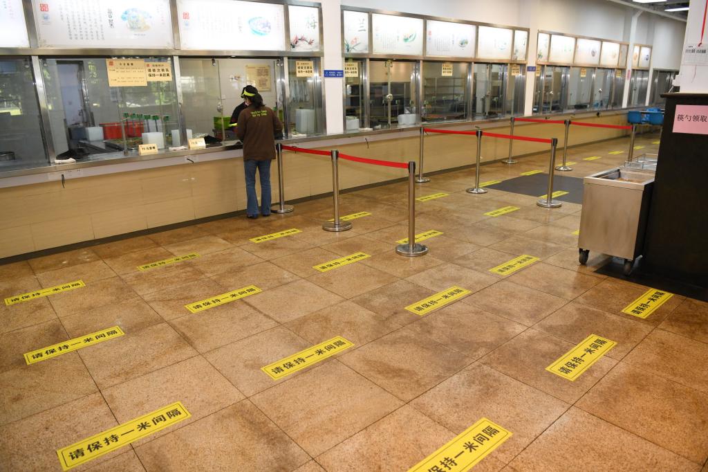 在学苑饮食广场,体温检测、排队一米隔离线、单向进出、分散就座等防控措施仍然没有放松,食堂就餐环境整洁、安全、有序。随着学生返校,学校将逐步开放更多食堂。校领导要求食堂继续严格落实落细各项防控措施不松懈,学生进入食堂就餐时要接受体温检测,佩戴好口罩;用餐前要洗手;排队过程中佩戴好口罩,用餐时方可脱下口罩;用餐时分散就座;合理安排用餐时间,错峰用餐;倡议师生打包带走、单独用餐;有发热、咳嗽等症状的同学,不得进入食堂就餐。