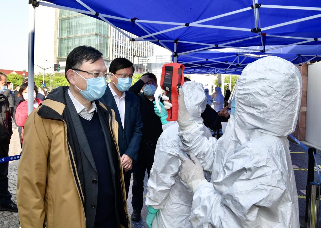 4月26日下午,同济大学举行学生返校应急处置模拟演练,校党委书记方守恩、校长陈杰等校领导一行先后来到四平路校区大门、图书馆、教学南楼、学苑食堂、西南二楼、医学院实验室,模拟体验学生入校、入住宿舍、上图书馆、食堂就餐、进实验室等返校学习生活的各环节,检查这些环节中各项防控措施的具体落实情况,以及早发现问题,进一步细化、完善工作方案,统筹做好校园常态化疫情防控和学生返校复学工作。